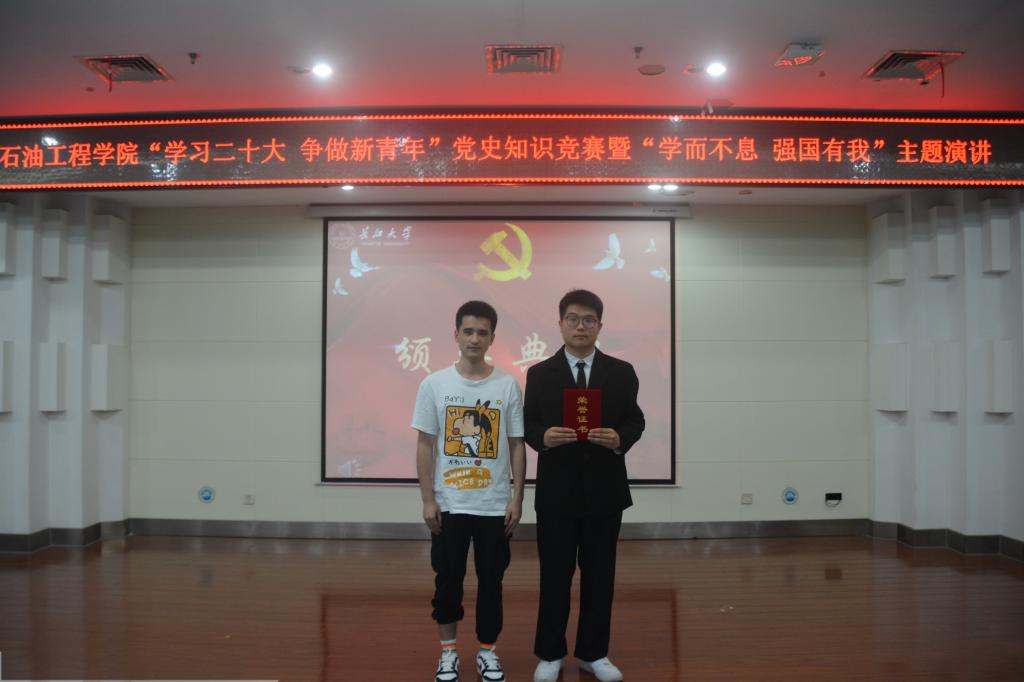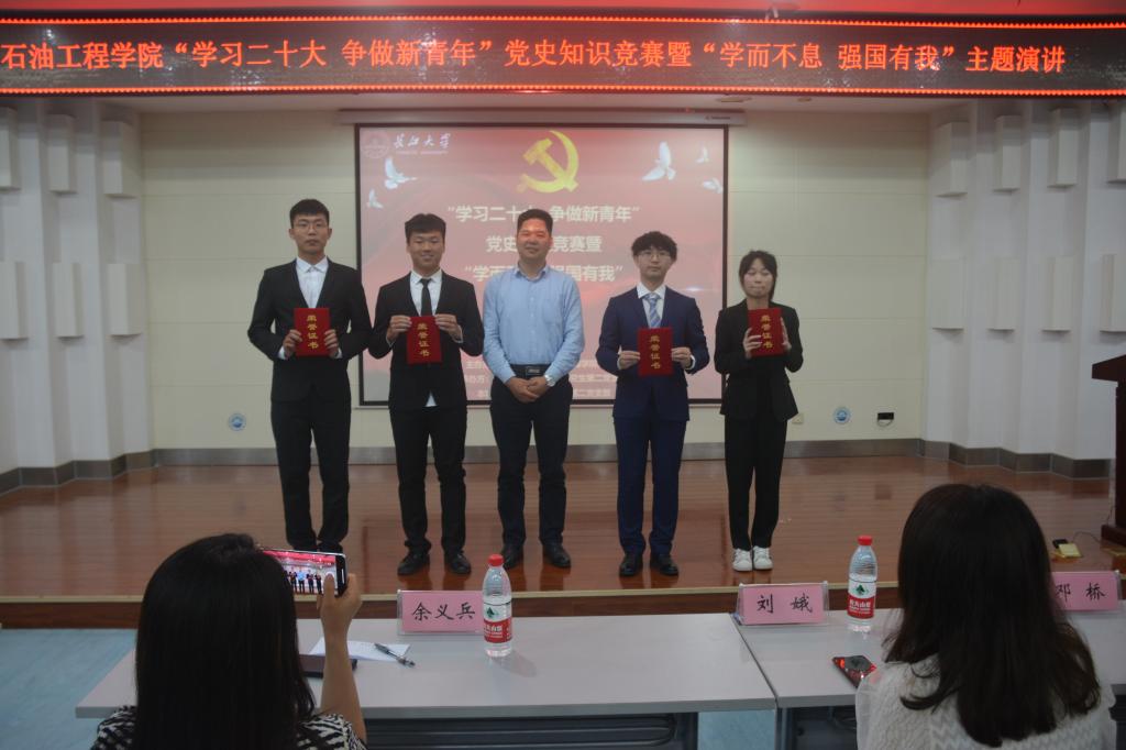 (通讯员 王雪瑶/文 刘科技 刘昕竹/文)2023年04月20日18:00,yl6809永利官网集团于图书馆报告厅顺利开展“学习二十大 争做新青年”党史知识竞赛暨“学而不息 强国有我”主题演讲活动。学院党委副书记刘娥、油气井工程系教工党支部邓桥、余义兵,学工办史永波、郭冀宁、周晓峰、陈金建老师莅临本次比赛现场。