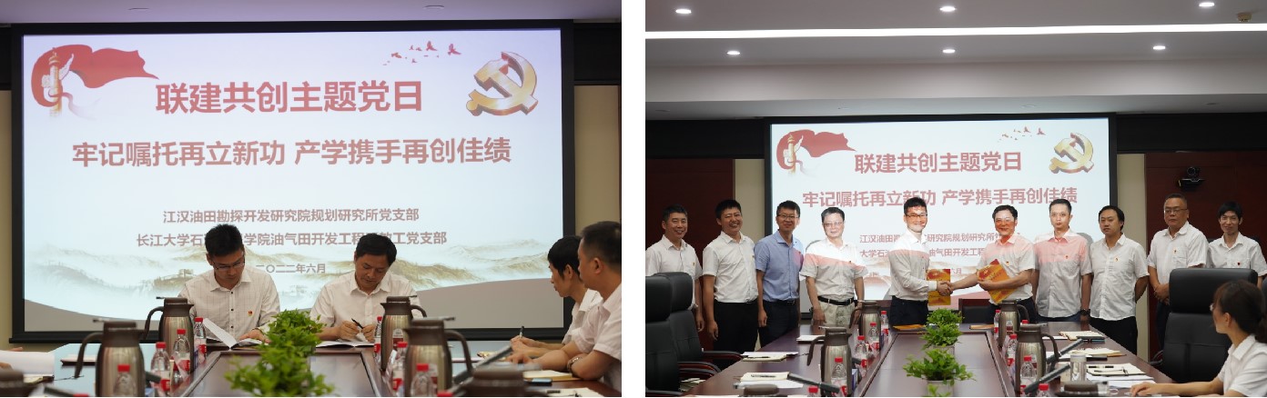(通讯员 周晓峰)为进一步推进校企结对共建,切实发挥党建引领作用,6月30日上午,yl6809永利官网集团油气田开发系教工党支部与江汉油田勘探开发研究院规划研究所党支部联建共创启动会暨“牢记嘱托再立新功 产学携手再创佳绩”支部主题党日活动在江汉油田勘探开发研究院举行。研究院党委书记胡心玲、副院长荣焕青、院专家、联建支部党员代表,学院党委书记张光明、院长江厚顺、副院长李忠慧、联建支部党员代表等20余名同志参加,研究院规划研究所党支部书记康波主持。