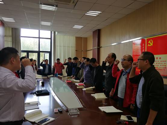 会上,全体党员面对党旗,紧握右拳,庄严重温入党誓词。