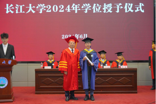 在激昂的乐声中,毕业生们身着崭新的学位服依次登上主席台,由副院长张顶学一一为同学们正衣冠,校党委常委、副校长江厚顺教授亲自为毕业生拨穗、授予学位证书、合影留念,并送上殷殷祝福。