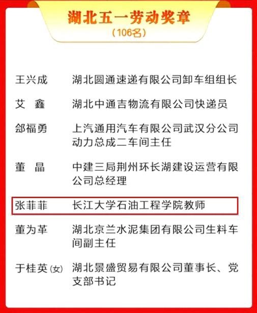4月29日上午,2024年湖北省庆祝“五一”国际劳动节座谈会在汉召开,56个单位、106名个人荣获湖北五一劳动奖状、奖章,106个集体荣获湖北省工人先锋号。其中,我院教师张菲菲获湖北五一劳动奖章。