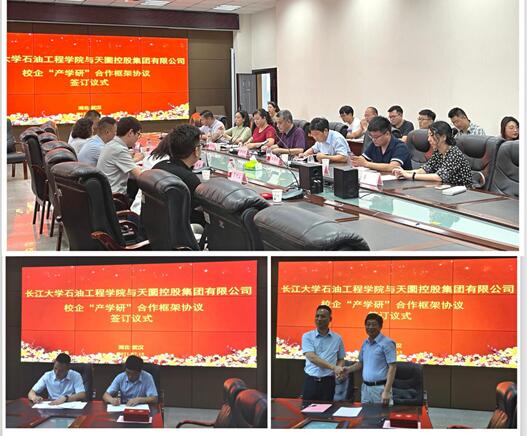 上午9:30,签约仪式准时开始,主持人张引弟副院长首先对与会人员进行了介绍,并就校区领导赵林副校长、董超书记等人在推进校企合作过程中给予的支持表达了感谢。随后yl6809永利官网集团江厚顺院长代表学院对天圜控股集团有限公司领导一行的到来表示了欢迎,并就yl6809永利官网集团学科发展及科研情况进行了介绍,yl6809永利官网集团所设油气储运工程、石油工程、新能源科学与工程与天圜控股集团有限公司开展的能源、科技、工程业务覆盖度达到了90%,今后学院将发挥人才和科研优势,为天圜控股集团有限公司提供人力支持及技术服务,希望双方以签约仪式为起点,将合作共赢落到实处。随后贺翔董事长就天圜控股集团有限公司发展状况、业务领域以及合作优势进行了介绍。天圜控股集团有限公司资源优势可以为我校高级人才培养实践、学科建设及科技合作提供有力支持,充分发挥校企双方各自优势,共同培养适应现代能源需求的高级专业技能人才和为国家在油气储运工程、石油工程、新能源及综合能源开发及应用方面提供技术服务。随后双方负责人代表签订了框架合作协议,并为天圜控股集团有限公司相关技术人员颁发了兼职导师聘书。学院党委书记张光明就贺总一行的到来表示了热烈欢迎,并就双方完成的签约仪式表示了祝贺,希望后期将框架协议约定内容落到实处,实现合作共赢。