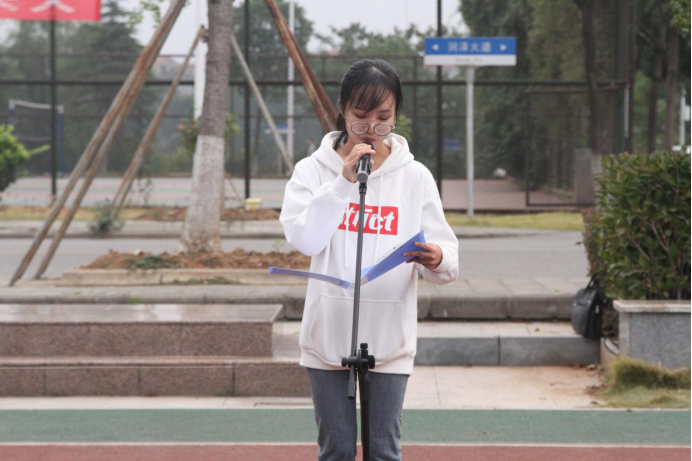 油工21905班李芷琦代表全体新生发表国旗下的讲话。她说“大学是一座守望塔,站在上面,展望的是一望无际、广阔无垠的新天地,而提前做好人生规划就是在为我们的梦想挂满指路明灯。”她还对同学们提出了几点建议:一是对待学习永远保持一颗热爱的心;二是让铁一样的的纪律锤炼出钢铁一般的意志;三是拥有敢想敢闯、不惧风雨的勇气和担当。