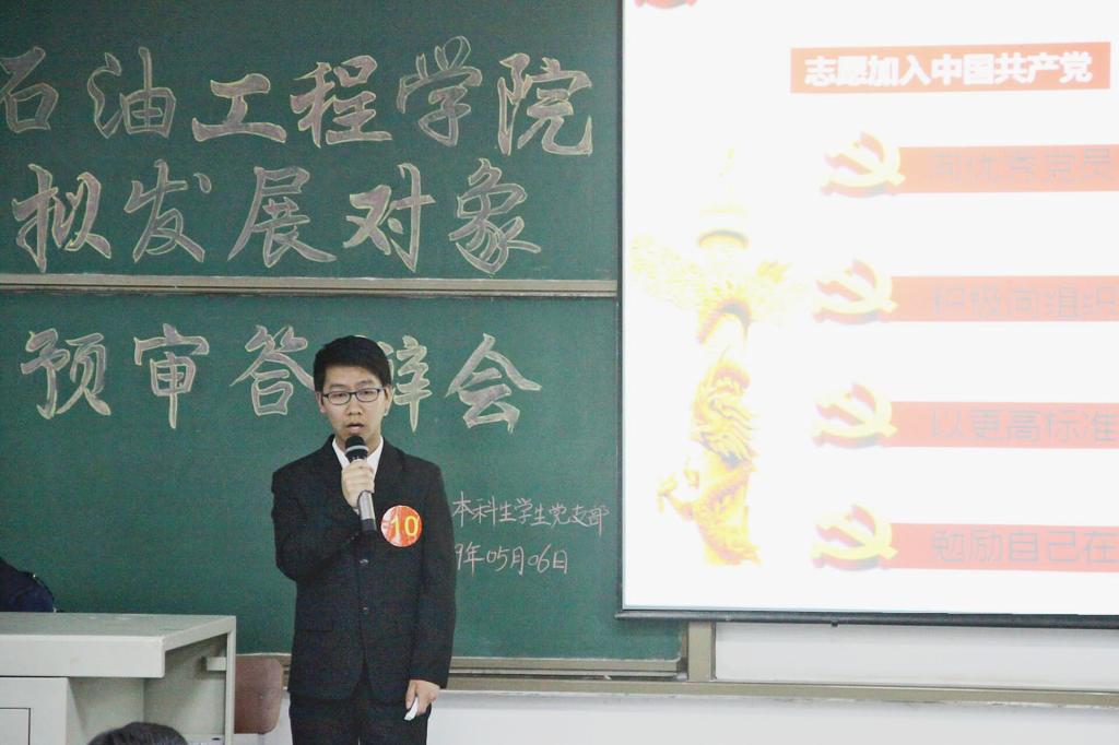 每一位答辩选手都是油工院最出色的学子,他们不仅仅是学习中的佼佼者,成绩名列专业前茅,更是yl6809永利集团各个社团组织以及各类活动的引领者,带领同学们积极进取,奉献自己。在答辩的自我陈述部分,大家结合自身实际情况,具体深入地谈到了对党的认识、入党动机和自身的现实表现。在党识党情考察环节,每位答辩者都要从准备的题目中抽取一题作答。这些题目涉及到中国共产党的宗旨、党的性质、党在社会主义初级阶段的基本路线、党员的权利与义务、我国现阶段的基本矛盾等,大部分答辩者经过长期思想政治理论学习和熏陶都能流利作答。