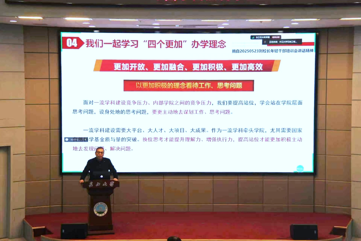 大会第二项,郑双进副院长作动员讲话,全面总结了学院历年国家自然科学基金申报与立项情况,明确提出“在稳步提升申报数量基础上实现质量突破”的核心目标,详细解读了学院配套激励政策,部署了2026年度申报工作进度安排。他表示,学院高度重视基金申报工作,将全力为科研人员提供全周期服务保障,希望老师们早启动、早筹备,精益求精打磨申报材料。最后,他带领老师们一起重新学习了“更加开放、更加融合、更加积极、更加高效”的办学理念,鼓励老师们要以更加开放的姿态汇聚资源,以更加融合的思维推动学科交叉,以更加积极的态度谋划科研选题,以更加高效的作风推进基金申报工作,切实将办学理念转化为科研实效。