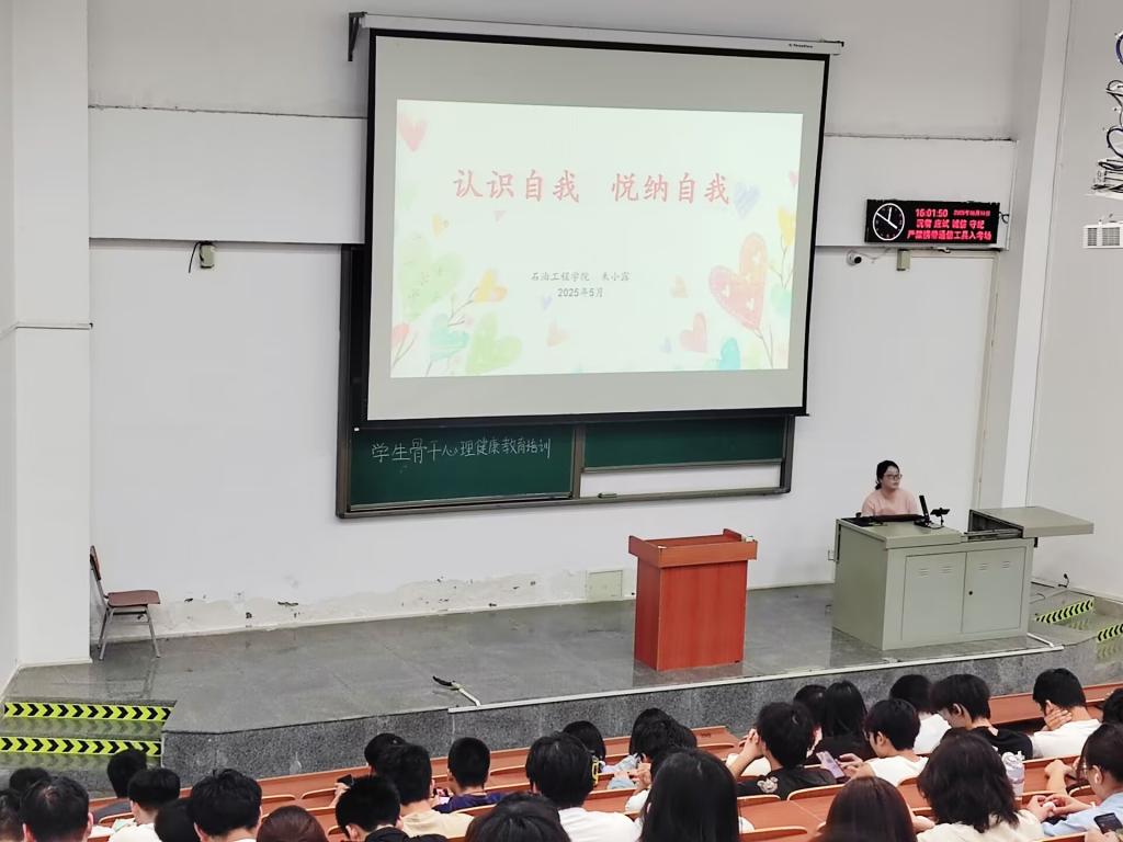 (通讯员 钟传延/摄 朱小露/文)5月15日下午,油工学院在武教B101教室面向全院学生干部开展 心理知识培训。培训主题为“认识自我 悦纳自我”,由学院心理专干朱小露老师主讲,旨在帮助学生干部提升心理健康水平,更好地服务同学。