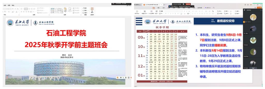 明确返校节点,做好行程规划。班会上,班主任对学业和返校事项作出系统安排,提醒同学们认真核查上学期成绩及学分获取情况,及时关注补考安排并做好复习准备。同时,会议明确了老生与新生的报到时间,要求学生合理安排行程、提前购票,严格按时返校。通过系统讲解和互动答疑,同学们进一步明确了返校流程和时间节点,显著提高了对新学期注册报到安排的认知度和配合度,有效避免了因信息不清导致的延迟返校情况。