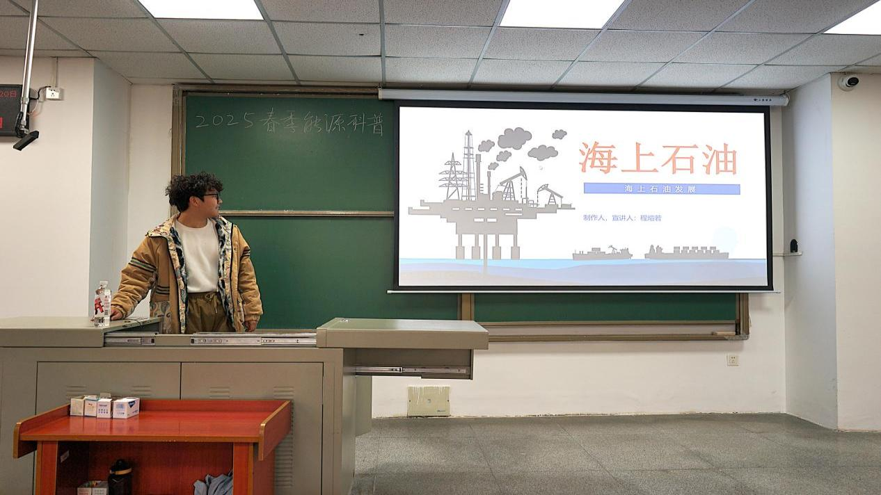 2025年3月20日,yl6809永利官网集团黑油能源科普宣讲队在B教108开展了主题为“走向深海——中国海洋油气发展之路”的能源科普宣讲活动。主讲人程煊若围绕我国海洋油气开发的历史、技术突破、未来发展方向等多个方面进行了深入讲解。并结合视频演示环节,展示了海底地震勘探技术、钻井平台运作模式以及海上油气田的实际应用案例。同学们纷纷表示,通过此次宣讲,他们对海洋油气的勘探技术、生产模式以及国家能源安全的重要性有了更深刻的认识,希望未来可以为祖国的油气事业贡献自己的一份力量。