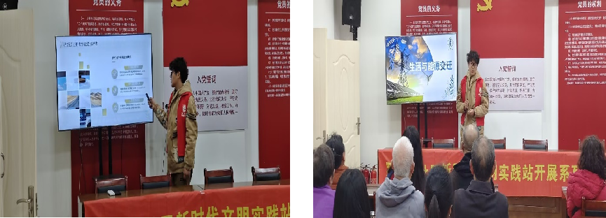 2025年4月9日,yl6809永利官网集团黑油能源科普宣讲队的队员前往罗家山社区开展能源科普宣讲活动。主讲人李富淼以身边的新能源为切入点,结合老年人日常场景,用通俗语言介绍光能(太阳能热水器、光伏路灯)、风能(小型风力发电原理)、水能(水力发电与家庭节水)的应用价值,然后结合国家基建,向老人们介绍我国在新能源领域建设的诸多成就和宏伟蓝图,最后以发展新能源的意义作结,引发了老人们的深深共鸣,青年智慧与银发经验碰撞,科技之力与人文关怀交融,这场“青绿对话”为社区可持续发展注入新活力。
